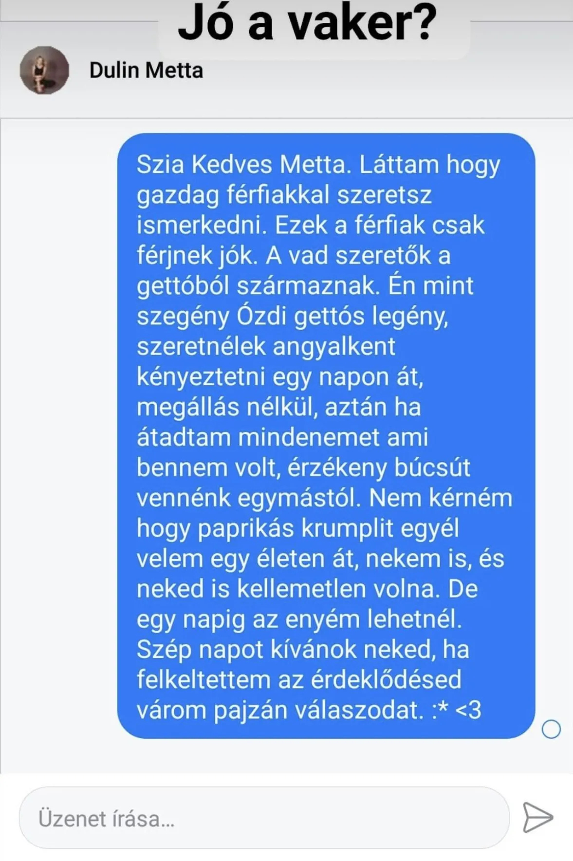 „Szia Kedves Metta! Láttam, hogy gazdag férfiakkal szeretsz ismerkedni. Ezek a férfiak csak férjnek jók. A vad szeretők a gettóból származnak. Én, mint szegény ózdi gettós legény, szeretnélek angyalként kényeztetni egy napon át megállás nélkül, aztán ha átadtam mindenemet, ami bennem volt, érzékeny búcsút vennénk egymástól” – kezdte üzenetébe a gengszter rapper, aki csak egy napot szeretne a celebtől. „Nem kérném, hogy paprikás krumplit egyél velem egy életen át, nekem is és neked is kellemetlen volna. De egy napig az enyém lehetnél” – szögezte le Szali, aki pajzán választ vár vissza, ha Metta nyitott az udvarlásra.