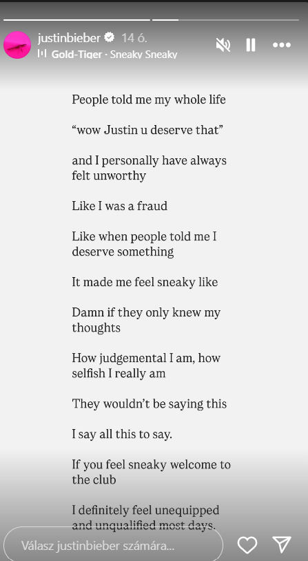 Újabb, aggodalomra okot adó, 24 órán keresztül elérhető Instagram-sztorit osztott meg Justin Bieber, ami miatt újra felreppentek a pletykák, miszerint baj lehet a világsztár mentális egészségével. Arról írt ugyanis, hogy imposztor szindrómában szenved, hogy úgy érzi, nem érdemel meg semmit. Csalónak érzi magát miatta, nem érti a dolgot. Azt kívánja, bárcsak ismernék az emberek a gondolatait. Azt, hogy mennyire ítélkező és önző ő valójában.