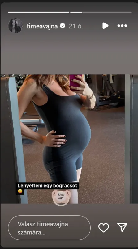 Amióta megszületett a kisfia, Tímea valósággal lubickol az anyaszerepben: a közösségi oldalán örömmel oszt meg fotókat a kis Benről, de ugyanilyen lelkesen mutatja meg egyre kerekebb hasát is. Nemrég például a 24 óráig elérhető Instagram-történetében posztolt egy fekete, szűk edzőruhában készült fényképet, amely tökéletesen kihangsúlyozta a kerekedő terhespocakját.