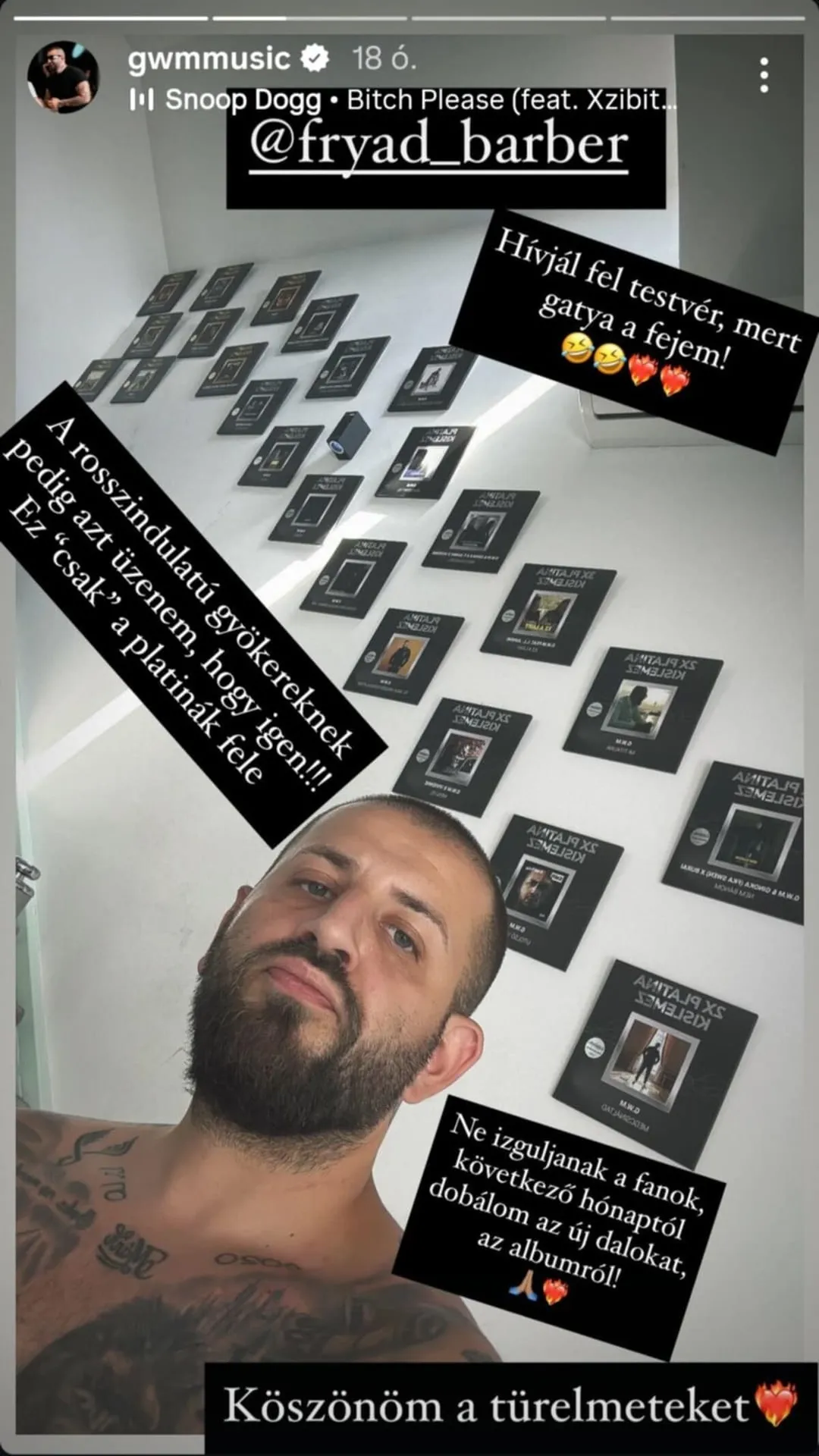 G.w.M most egy kőkemény Insta Storyban üzent a rosszakaróinak, ráadásul a rá jellemző stílusban, ugyanis a háttérben egy platinalemezekkel teli fal látható, ami előtt büszkén pózol.