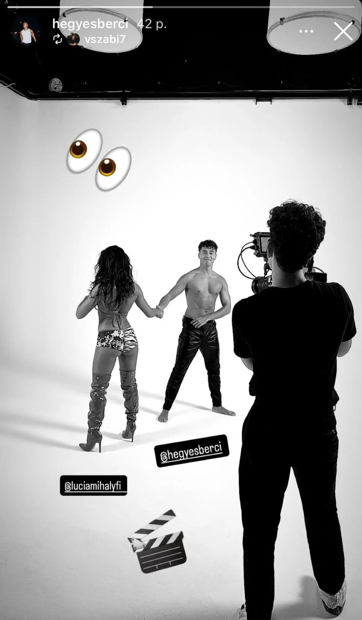 A fekete-fehér Insta-sztoriban Luca apró, alig takaró shortban és combcsizmában feszít, míg Berci félmeztelenül, bőrnadrágban mutatja meg, hogy nem csak a lépései, de a kockái is tökéletesen összehangoltak partnernőjével. A kulisszák mögött készült felvételen egy stábtag kamerázza őket, ám minden figyelem a duóra irányul.