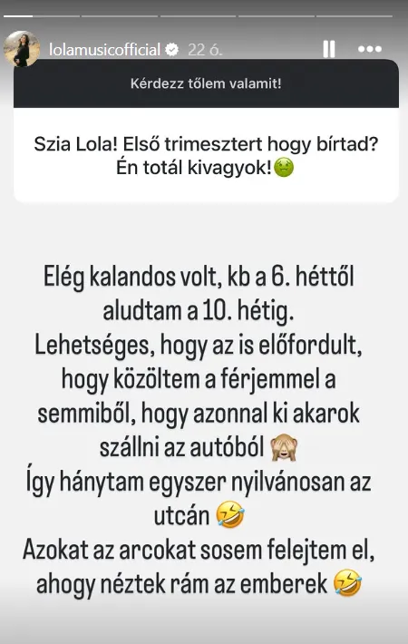 Az énekesnőtől egy közösségi médiás kérdezz-felelek során kérdezte arról egy kismama, akit megvisel az első trimeszter, hogy Lola hogyan viselte az első három hónapot. A boldog anyuka pedig erre őszinte választ adott 24 órán keresztül elérhető Instagram-történetében: