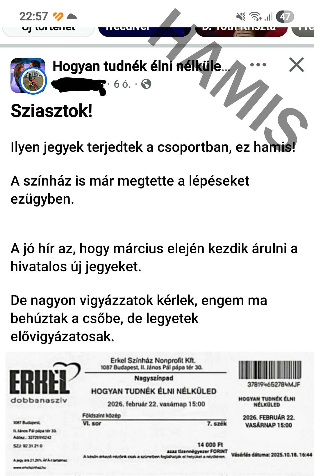 A 2024 decemberében bemutatott film tavaly az egész évet uralta, gyakorlatilag folyamatosan telt házzal futottak a mozik, amelyre a rendszerváltás óta nem volt példa. A Hogyan tudnék élni nélküled színházi adaptációja felrobbantotta a színpadot múlt hétvégén, a darabra szinte lehetetlen jegyet kapni, nem meglepő, hogy a csalók is azonnal akcióba lendültek.