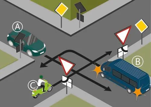 A legtöbben azzal rontják el a választ, hogy szerintük a C jelű motoros haladhat át a kereszteződésen elsőként, mert egyenesen halad. Azonban a sorrend nem ez; a KRESZ-feladat megoldása az, hogy elsőnek az A jelű autó, aztán a B jelű kisteherautó mehet, és a legvégén a C jelzésű motoros. Ugyanis az A jelű jármű kanyarodó főútvonalat készül elhagyni, és a KRESZ (1/1975. (II.5.) KPM-BM együttes rendelet szerint elsőbbsége van ebben az esetben. A B és a C jelű járművekre pedig a jobbkéz-szabály érvényes: tehát az A után a B jelű kisteherautó mehet, a legvégén pedig a motoros.