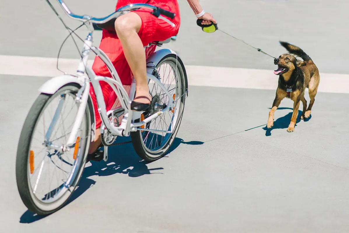 A biciklizés a kutyával szinte mindenhogyan szabálytalan, bár tény, hogy maga a KRESZ csak a pórázon vezetést tiltja – ám ha póráz nélkül üget mellettünk a kutya, akkor más szabályt sértünk, hiszen közterületen az ebeket csak pórázon vezetve sétáltathatjuk. Ez alól csupán a kutyafuttatók területe kivétel. A KRESZ úgy fogalmaz, hogy „tilos kerékpárral állatot vezetni.” Tehát semmilyen formában nem szabályos, ha a kutyánk mellettünk fut, míg biciklizünk; akár a rendőr, akár a közterület-felügyelő megbírságolhat bennünket. Gyakorlatban azonban nem szokott erre sor kerülni, de nem csupán a szabályszegés az egyetlen ok, amiért nem tanácsos a biciklizés a kutyával. Ugyanis fegyelmezetlen vagy félős kutya esetén elég egy zavaró tényező, például egy, az úton átszaladó macska ahhoz, hogy hatalmasat essünk, és akár súlyosan megsérüljünk, vagy ami még rosszabb: balesetet okozzunk.