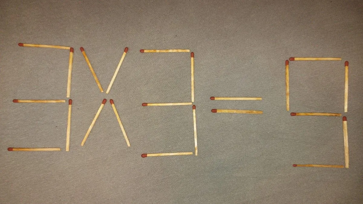 A képlet bal oldalán található két kilencesből egy-egy gyufaszál elvételével két hármast kapunk, az így szerzett két gyufaszál segítségével pedig az osztásjelből alkossunk szorzásjelet. Háromszor három pedig kilenc.