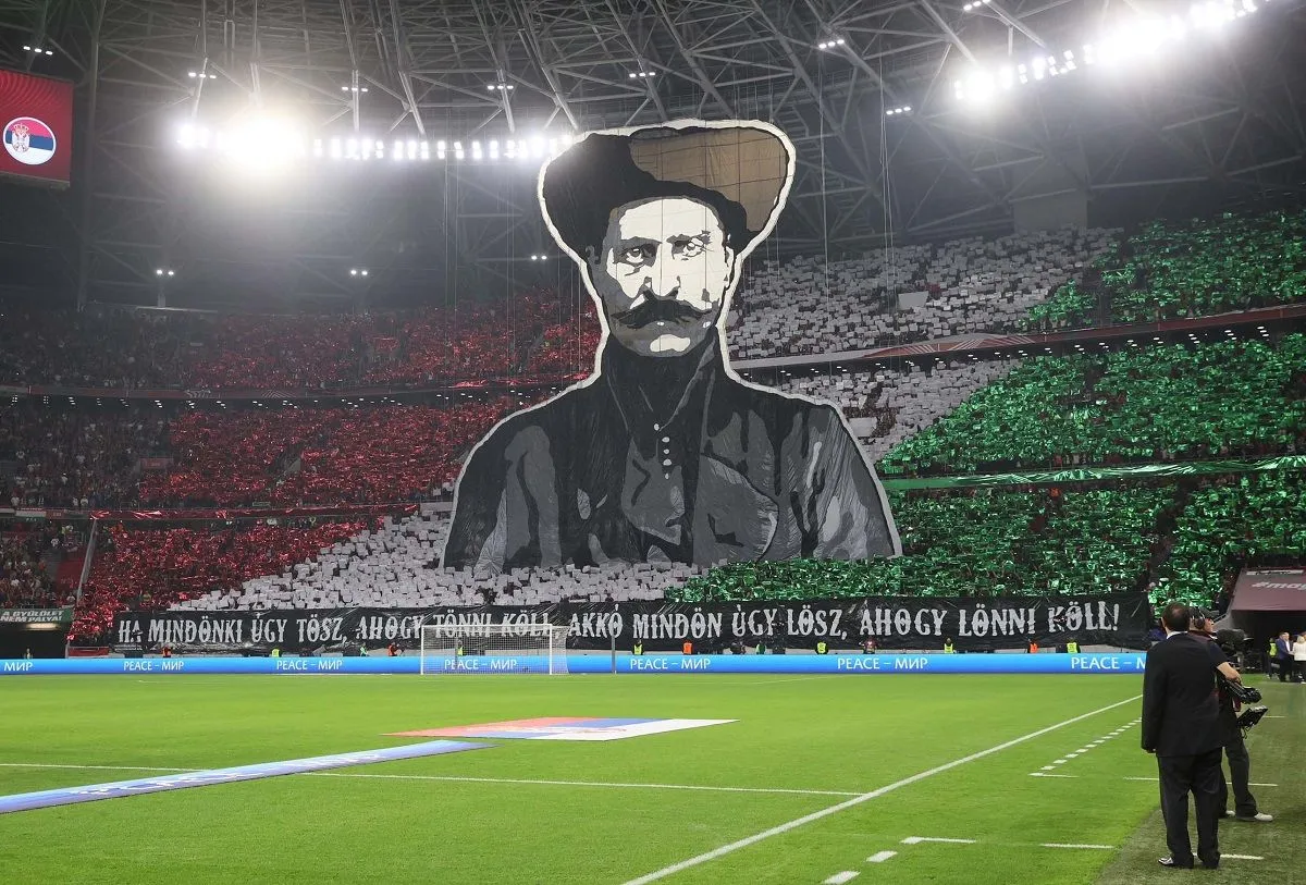 A magyarok egy Rózsa Sándort ábrázoló nagy zászlót bontottak ki, amely átívelte az egész lelátót. Ő volt a leghíresebb magyar útonálló, aki a 19. század folyamán tevékenykedett a mai Dél-Magyarország és a Vajdaság területén