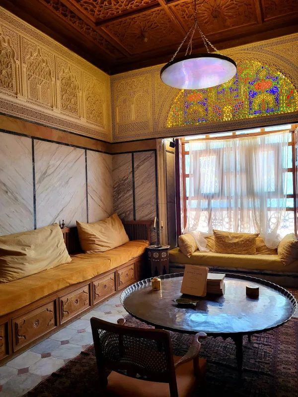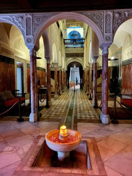 Szintén a bárónak köszönhető a város épületeinek kék-fehér színvilága. A báró hegytetőn épült mesés palotája, a különleges atmoszférájú Palace Dar Nejma Ezzahra ma látogatható, termeinek egy része zene- és hangszermúzeum.
