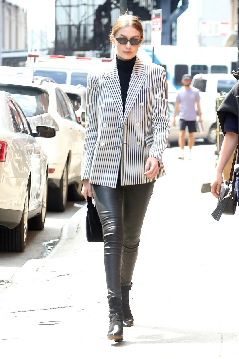 Csíkos blézerhez egy bőrnadrág. Illik hozzá egy zártabb felső. Viselj divatos garbót!