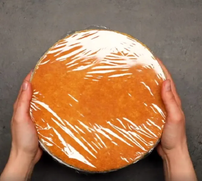 6. Egy kör alakú piskótát helyezz rá, úgy, hogy az tökéletesen lezárja a tálat. Fedd le fóliával, és tedd be a hűtőbe legalább 4 órára.