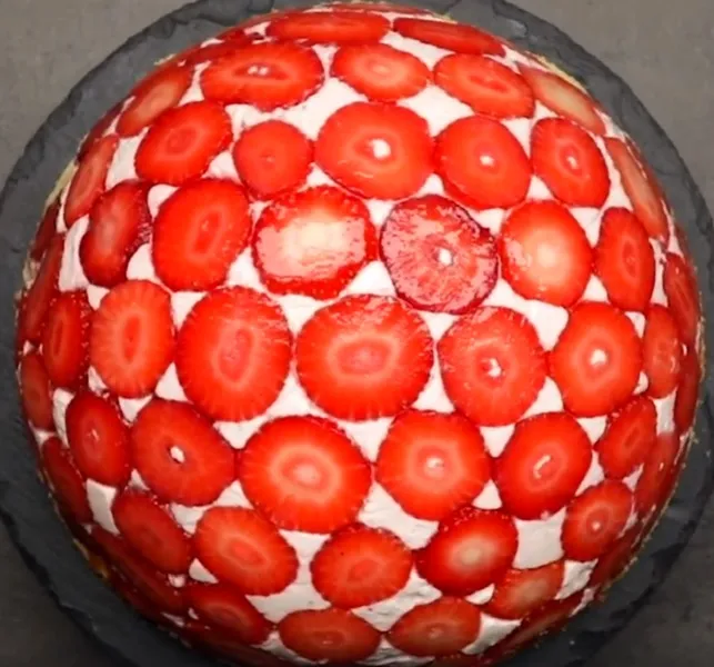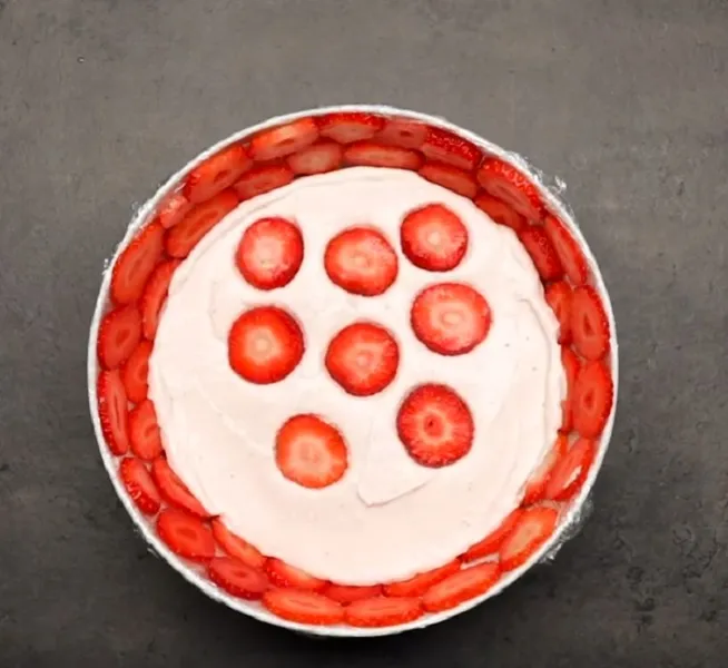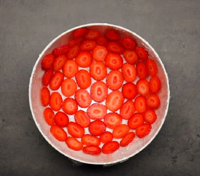 1. Egy kupola formájú tálat bélelj ki fóliával. 200 g epret pucolj meg, mosd meg és vágd ketté. A tálba szépen helyezd el úgy őket, hogy teljesen lefedjék a tál alsó felületét.