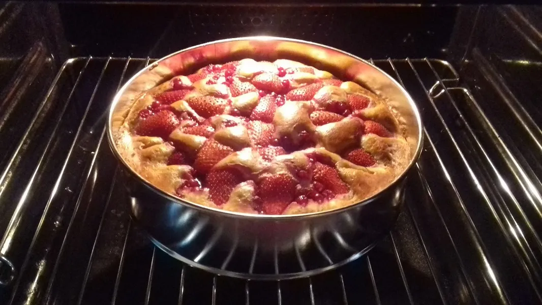 5. Díszítsd a tortaformában lévő tésztát ízlésesen. Szórd bele a ribizliszemeket, a megmosott félbevágott epreket tedd a szélére.