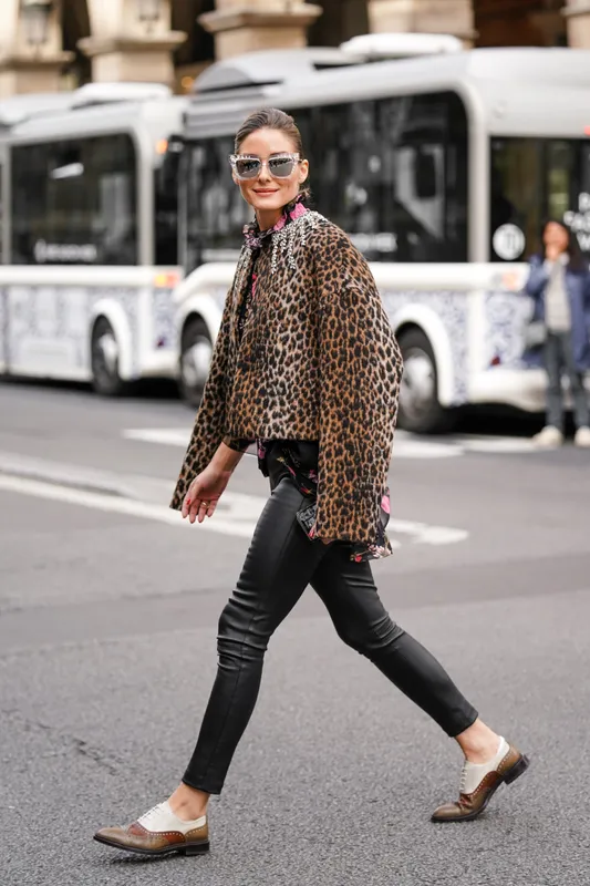 4. Egy elegáns szettbe is beillesztheted, viseld bőrből a leggingset, válassz hozzá trendi cipőt és egy állatmintás kabátot.