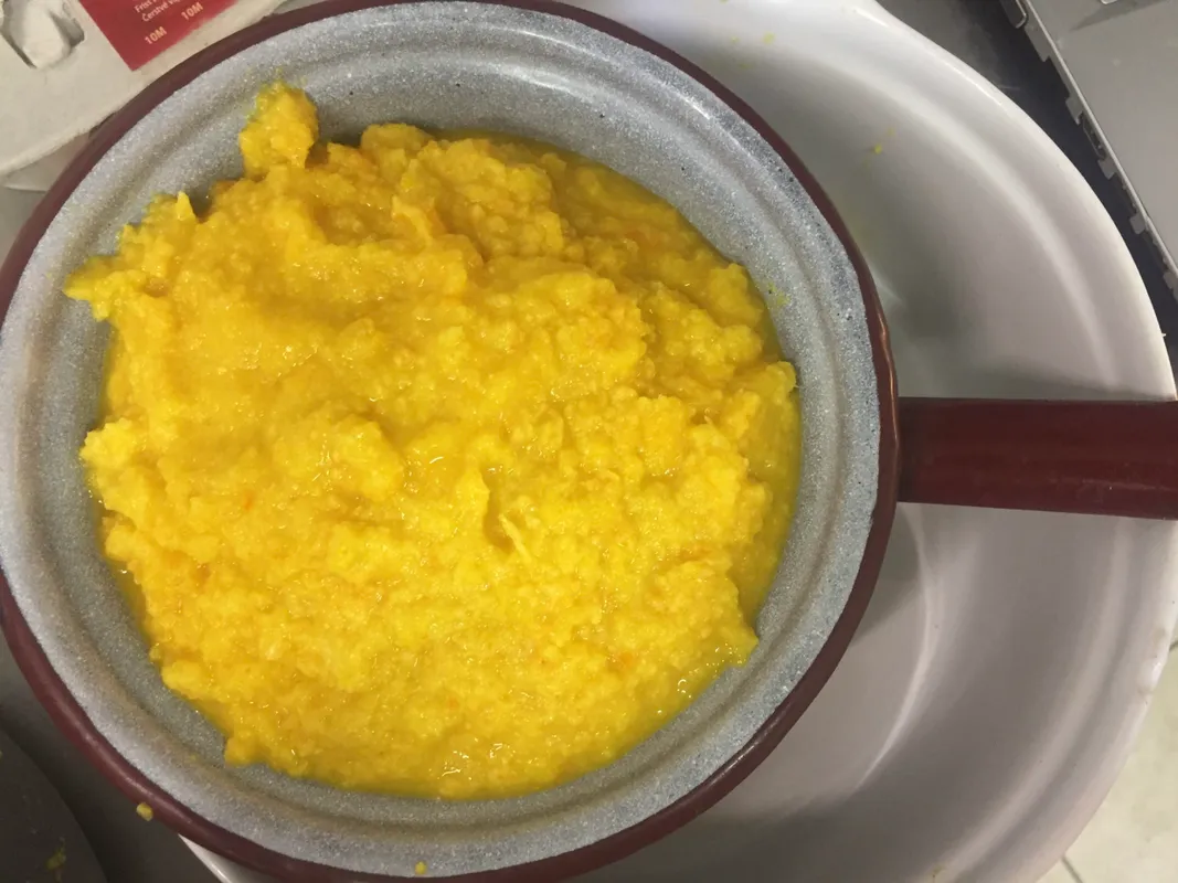 3. Ha letelt a főzési idő, emeljük ki a narancsokat a vízből, hagyjuk kihűlni. Ha már lehet velük dolgozni, hámozzuk meg a narancsokat. A héjakat, illetve a gyümölcs húsát tegyük aprítógépbe, a hártyás rekeszfalakat viszont dobjuk ki. Indítsuk el a készüléket, végül egy illatos sima pépet kell kapnunk. A narancspépet dolgozzuk össze a mandulaőrleménnyel.