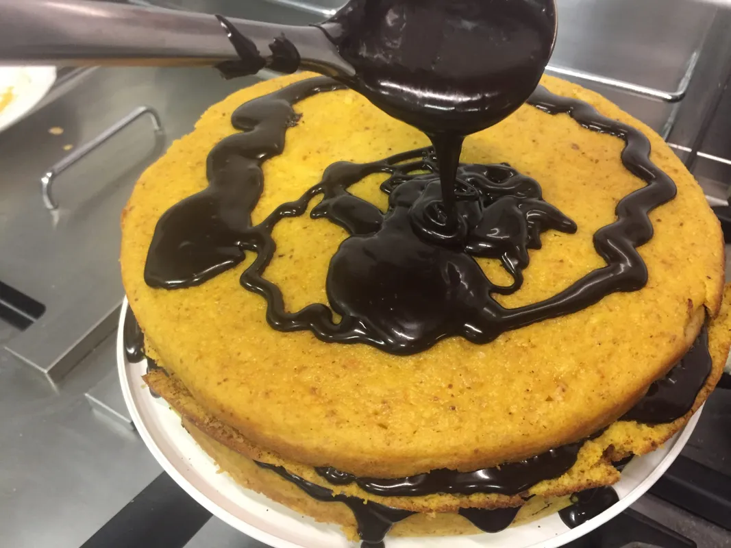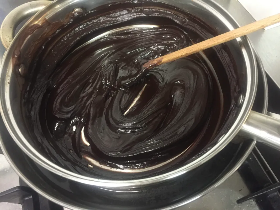 6. Míg sül a tészta, készítsük el a tölteléket. A csokoládét és a vajat vízgőz fölött olvasszuk fel. Egy másik edényben folyamatos kevergetés mellett forraljuk fel a tejszínt a cukorral. Alacsony lángon 5 percig hagyjuk gyöngyözni, majd húzzuk le a tűzről.
