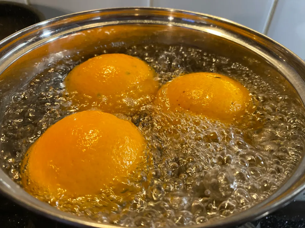 2. A három narancsot tegyük egyben egy edénybe és öntsük fel annyi vízzel, amennyi ellepi. Lassú tűzön forraljuk 1 órán át. Közben finoman pirítsuk meg a mandulát, majd aprító- vagy turmixgépben őröljük morzsalékosra.