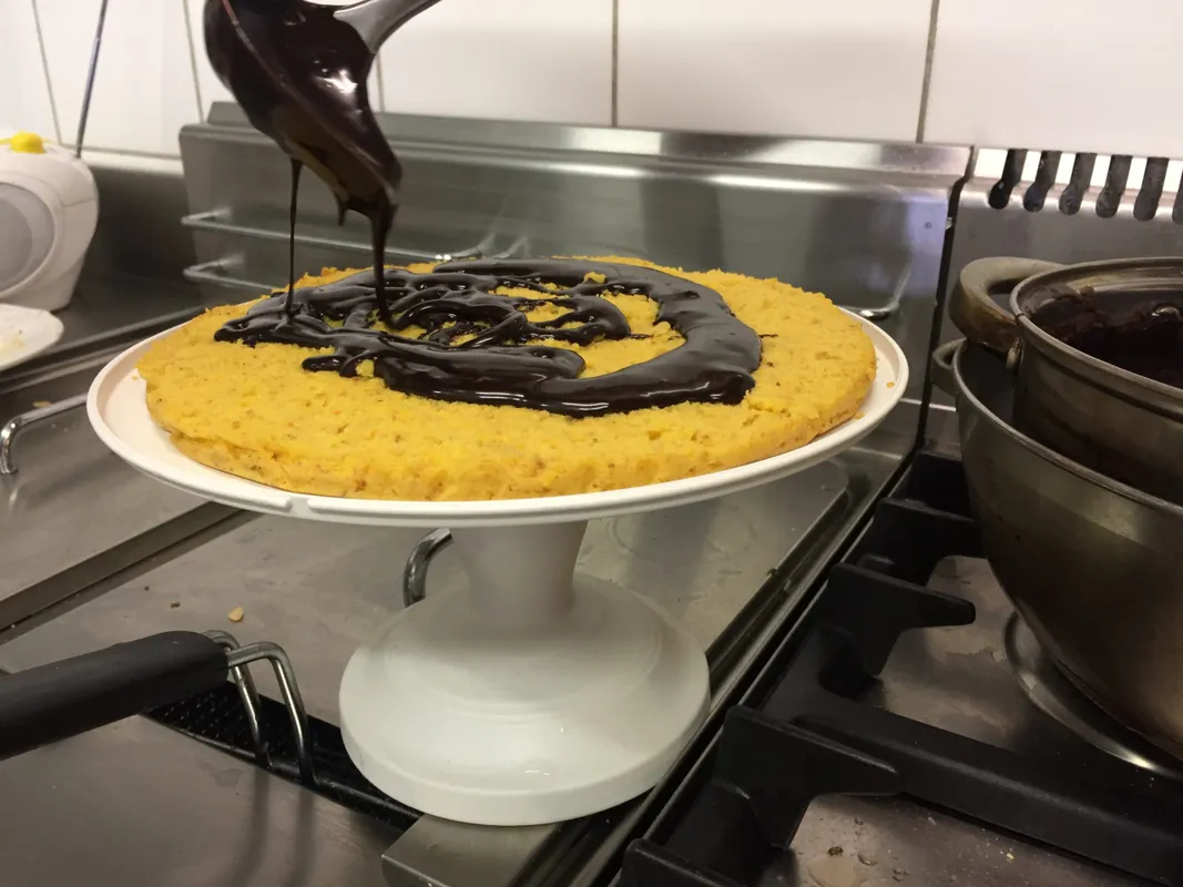 7. Keverjük össze a forró tejszínt és a vajas csokoládét, majd hagyjuk a keveréket hűlni, de közben folyamatosan kevergessük. Mire ide jutunk, a tészta is biztosan megsül. A kész lapokat emeljük ki a kapcsos formából és hagyjuk kihűlni.