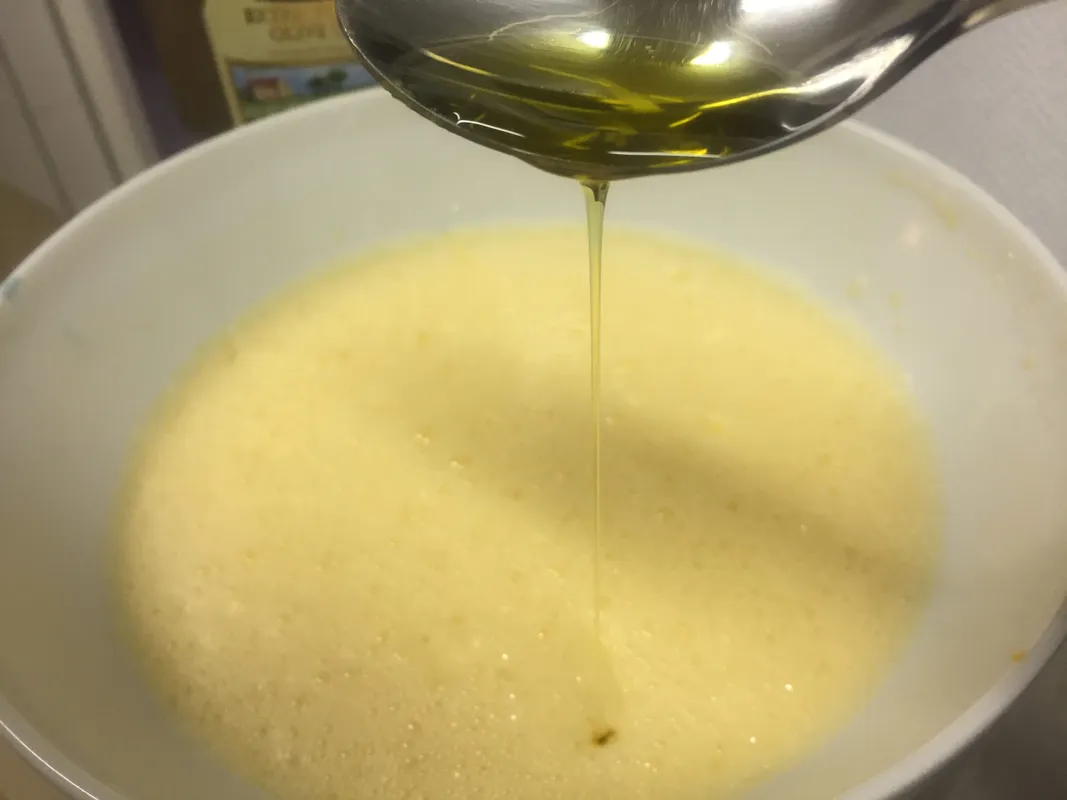5. A tojásokat habosítsuk ki a cukorral egy nagyobb tálban, majd kanalanként csorgassuk bele az olívaolajat. Óvatosan adagolva adjuk hozzá a lisztet, a sütőport, a szódabikarbónát és a sót, végül pedig a mandulás narancspépet is. A tésztát simítsuk bele az előkészített sütőformákba, majd tegyük a sütőbe. A várható sütési idő 15-20 perc. Ha egy formával dolgozunk, rá kell számolni kb. 8 percet.