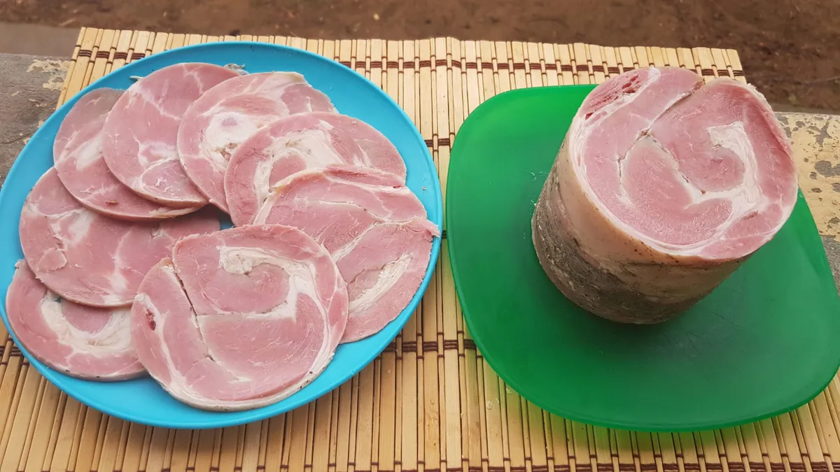 Ehhez jó vastag, legalább 2 kilós combszeletet kell vásárolni. A combot alaposan besózom, majd egy tálban 3 napra a hűtőbe teszem, naponta átforgatom. A 4. napon vizes pácot készítek 4-5 babérlevél, kb. 20 szem fekete bors, egy egész fej hagyma, 4-5 cikk fokhagyma, pár szem koriandermag felhasználásával, ebbe a pácba rakom a sós combot és hagyom egy hétig a hűtőben állni. Mikor letelt a hét, kiveszem a vizes pácból és beleigazítom a présbe, lezárom és egy egész éjjelre a hűtőbe rakom a préssel együtt. Másnap egy nagy fazékba vizet töltök, beleállítom a prést, és 80 fokon tartom 4,5 órán keresztül. Kiveszem a vízből a prést, lehűtöm és visszarakom a hűtőbe. Reggel kiveszem a présből a sonkát és már lehet is szeletelni. Én géppel szoktam, de éles késsel is könnyen vágható.