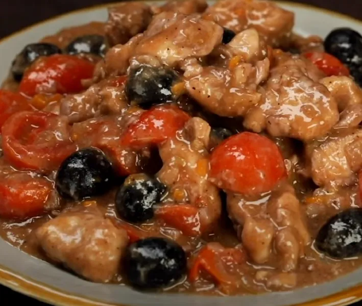 A paradicsomokat mosd meg és vágd ketté. Majd add hozzá a csirkés raguhoz, sózd, borsózd. Add hozzá a rozmaringot és a magozott olívabogyókat. Keverd meg, majd fedő alatt 15 percig párold.