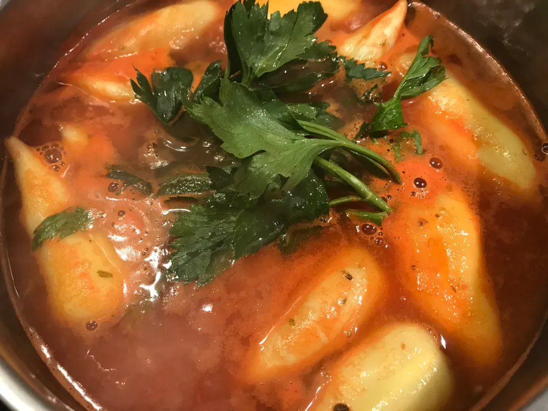 3. Egy alkalmas méretű lábosban forraljunk fel kb. 1 liter vizet, mehetnek bele a zöldfűszer ágacskák, majd óvatosan helyezzük bele a megtöltött paprikákat. Mehet a lébe a só és a hagymafej is. Öntsük fel az alapot a paradicsomlével, igény szerint cukrot és sűrített paradicsomot is adhatunk hozzá. A kimaradt húsgombócokat felforrás után 20 perccel tegyük a lébe. Gyenge lángon bő egy-másfél órát főzzük a töltött paprikát. Néha nézzünk rá, nehogy túlságosan besűrűsödjön vagy alulról odakapjon. Amikor úgy érezzük, hogy minden megpuhult, gyenge rántással sűrítsük be a paradicsomszószt. Ellenőrizzük az ízeket, frissen, forrón tálaljuk a töltött paprikát.