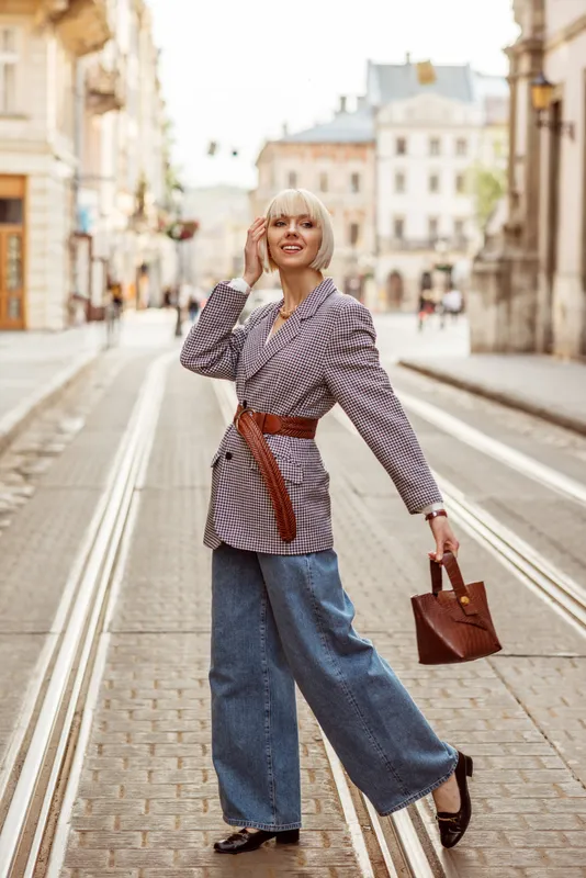 Nagyon bő farmerhez csinos egy blézer, feltétlenül vegyél fel hozzá övet, nem csak kiegészítőnek jó, de kiemeli az alakod. Harmonizáld az övet a táskával, így szuper lesz a szetted.