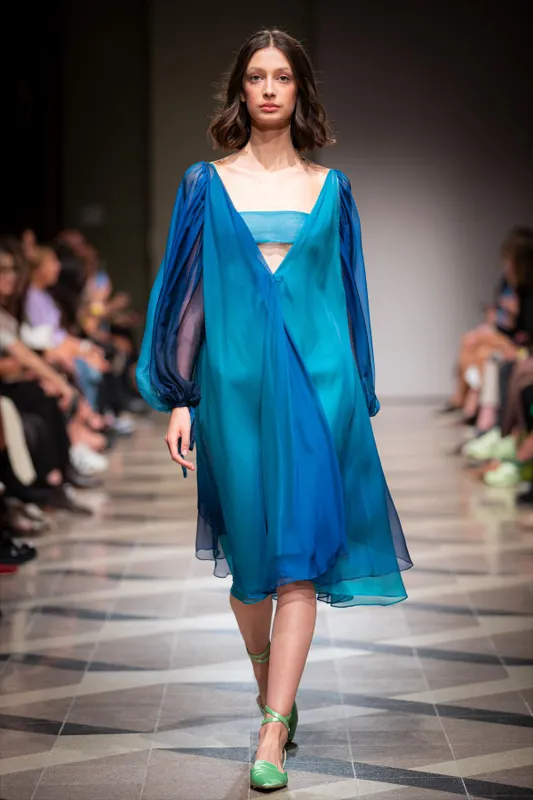 Csodás kék színű könnyed és légies ruha, zöld cipővel, igazi telitalálat. A tavasz egyik kedvenc viselete lesz.
