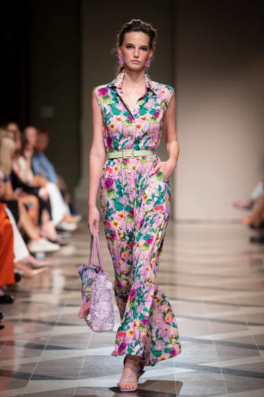 Tavaszi virágos rét hangulatát idéző hosszú ingruha, övvel, harmóniában lévő szandállal és kiegészítkkel a tervezőt is dícsérik. Mindennapokban ezt a szettet bárki felveheti.