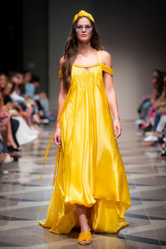 A sárgászöld színárnyalatban megálmodott és megalkotott fodros maxi ruha a tervező stílusérzékét dicséri.