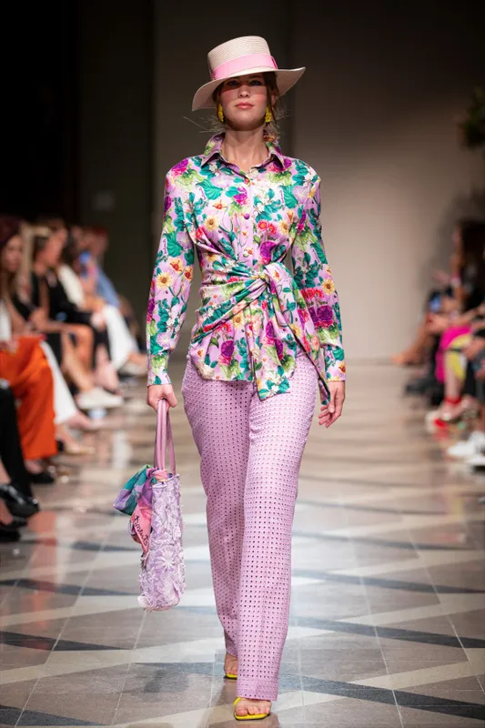 "A nőknek, akik viselik az érzelmeiket" mottó hűen jellemzi a képen látható szettet. letisztult, érzéki, kifinomult trendek közé tartozik a kreatív virágos blúz és a színben harmóniában hozzá tartozó egyenes szabású nadrág.