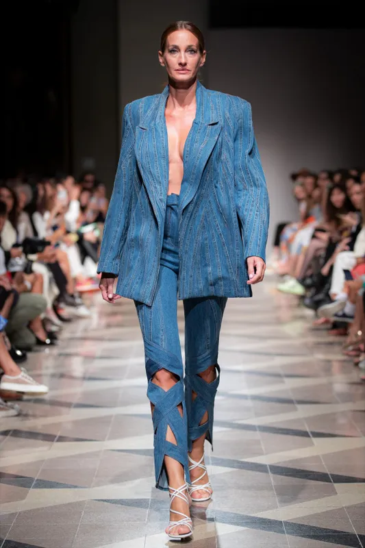 Mindenképp innovatív, merész oversize zakó, a farmerszalagokból létrejött nadrággal ütős páros alkot.