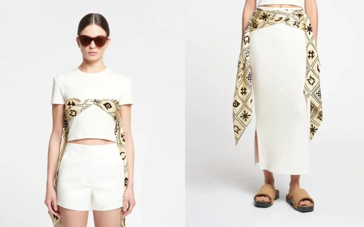 A bordás jersey-re terített és átkötött selyemsálak pedig kontrasztot teremtenek mind a ruha szerkezetében, mind az esztétikai hatásban. Ez a kollekció megtestesíti a Nanushka egyedi márkaszellemét az emelt szintű kézműves és koncepcionális technikák révén.